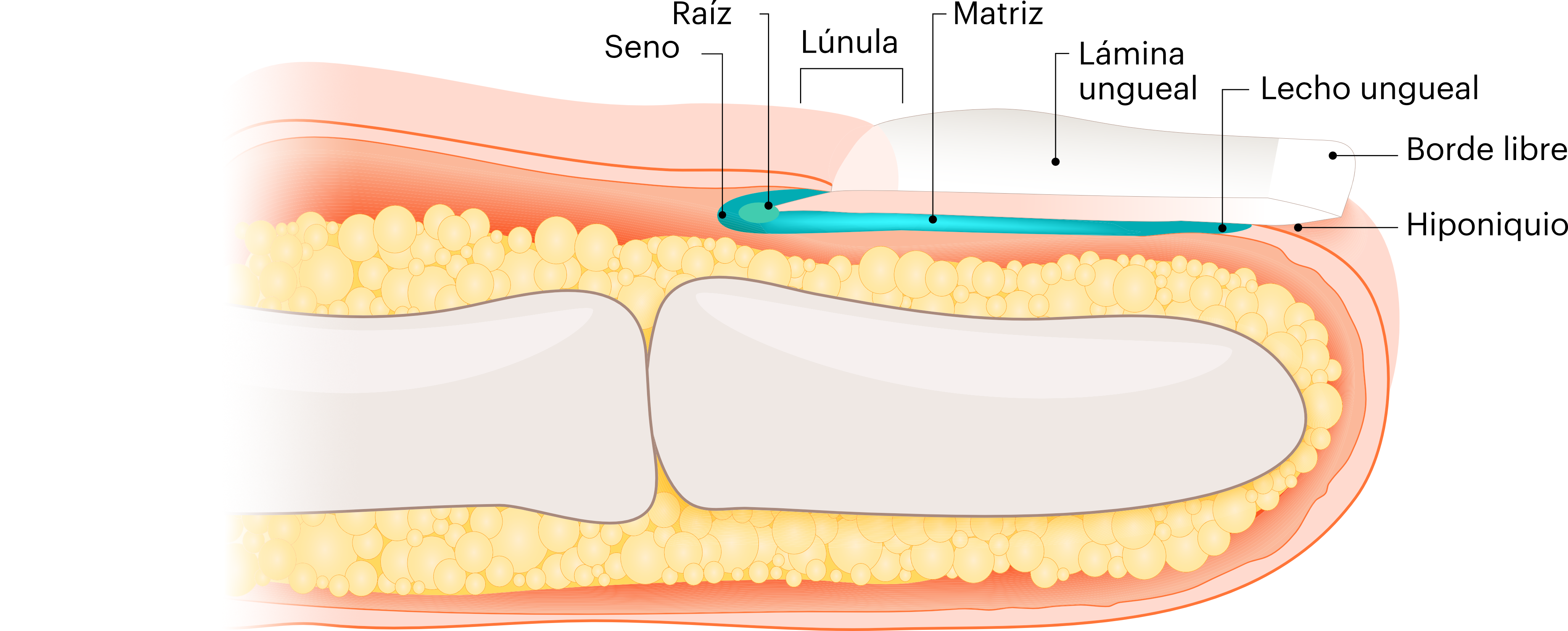 - por expansión de una infección fúngica en la piel (p. ej., tinea pedis o pie de atleta). En la mayoría de casos, la onicomicosis va precedida de una tinea pedis asintomática, seca e hiperqueratósica. Con el tiempo, el ambiente oscuro, húmedo y cálido del interior de los zapatos y la presión ejercida sobre la uña pueden dar lugar a microtraumatismos que rompen el hiponiquio (ver Figura 1), lo que permite la entrada de dermatofitos en el lecho ungueal.