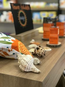 - Vista: Carteles o imágenes del sol y el solar, conchas, etc. Crea un espacio en la farmacia donde inspire a verano.