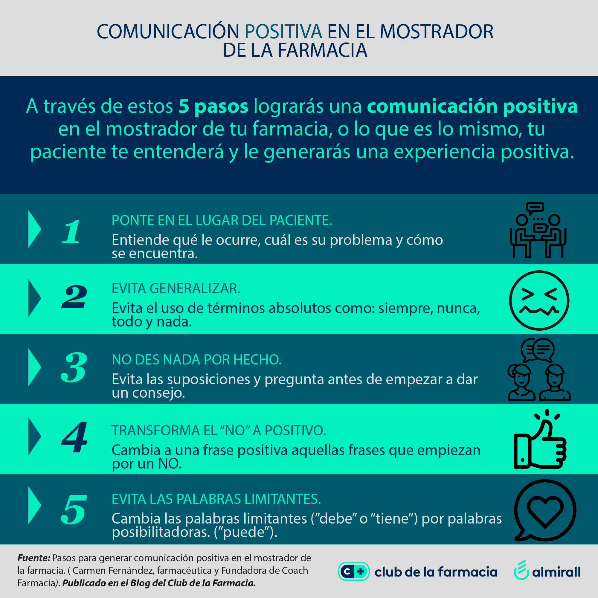 ¿Cuántos de estos pasos estás realizando en el mostrador de tu farmacia? Espero que hayas tomado nota de todos ellos y que te animes a practicar la comunicación positiva en el mostrador de tu farmacia.