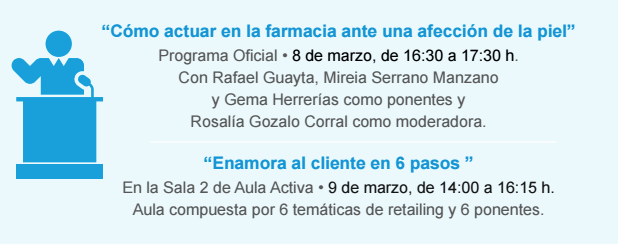 El martes 8 de marzo, estaremos en la sala 3 a las 16,30h hablando de cómo actuar ante una afección de la piel. Contaremos con un grupo de ponentes ampliamente reconocido en la farmacia y muy respetado en el sector: