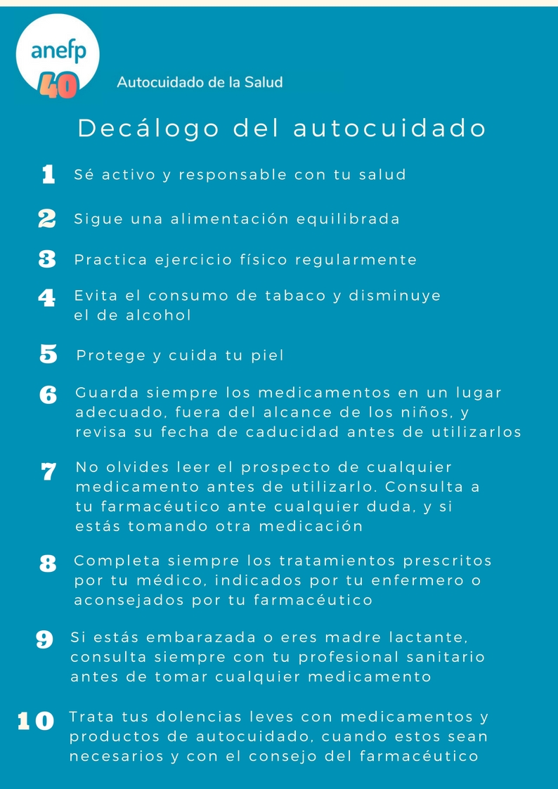 Desde Anefp se ha publicado el Decálogo del Autocuidado que recoge los 10 consejos a seguir en nuestro día a día para disfrutar de una buena salud. Te lo detallamos a continuación: