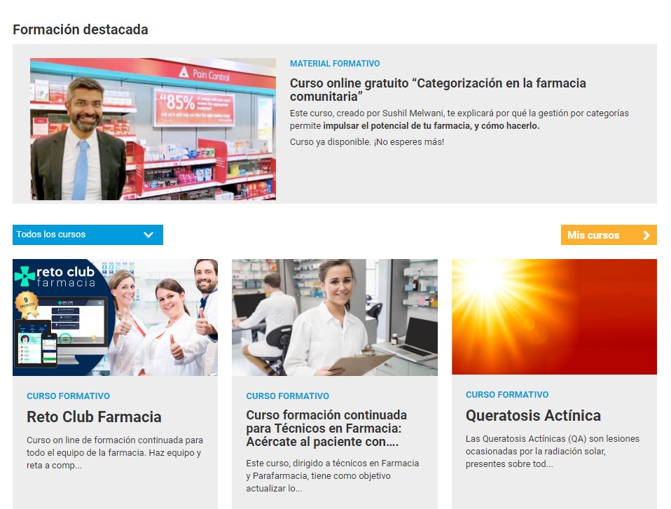 En el apartado Formación del Club de la Farmacia encontrarás diferentes cursos para formarte de manera online y a tu ritmo sobre patologías, gestión de la oficina de farmacia o atención farmacéutica. Los encontrarás en este enlace.