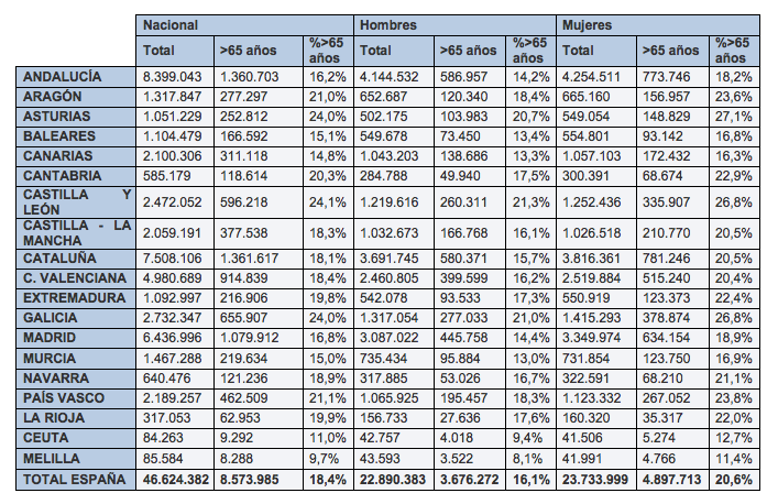 Tal y como muestra la tabla anterior, la distribución de mayores de 65 años no se distribuye de manera homogénea en todas las CCAA, siendo por ejemplo, Castilla y León y Galicia las que presentan mayor porcentaje de población mayor de 65 años (24%) y, por otro lado, Canarias, Murcia, Melilla y Ceuta las que poseen menor porcentaje (10-15%).