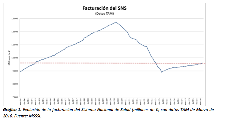Tal y como indica el gráfico anterior, se observa un crecimiento en la facturación del SNS hasta 2010, alcanzando unos valores de entre 12.500 y 12.700 millones de € a mediados de ese año. Dichos valores de facturación se ven fuertemente afectados hasta mediados de 2013 (llegando a una facturación de unos 8.900 millones de €), y parece que actualmente se estabilizan, con un valor de 9.608 millones de €, estando la facturación actual a los mismos niveles que a principios de 2005.