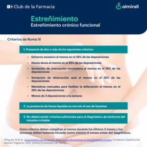 - Estreñimiento crónico: Su duración es superior a 12 semanas sea cual sea la causa. Cuando se han descartado alteraciones estructurales, metabólicas, enfermedades neurológicas o sistémicas, se habla entonces de estreñimiento crónico idiopático o funcional. Su diagnóstico clínico se establece en base a los criterios de Roma III.