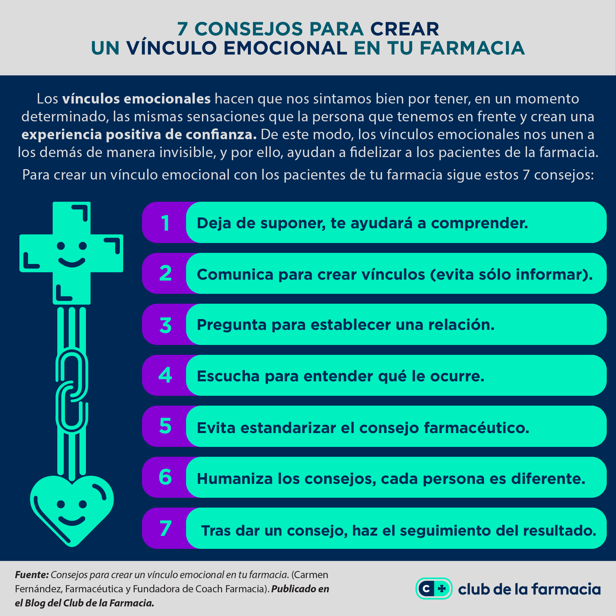 A continuación te enumero 7 consejos que te ayudarán a crear un vínculo emocional en la farmacia con los pacientes / clientes.