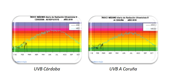 Aunque podamos creer que no es lo mismo un escaparate en mitad de Córdoba (cuyas temperaturas son superiores a +40° en una ola de calor) respecto a una farmacia de la Coruña, los niveles de radiación UVB que vemos a través de este gráfico nos muestran que la media de radiación es muy semejante durante todo el año y muchos envases plásticos no bloquean el total de la radiación visible (la línea azul representa la media de 2005-2017).