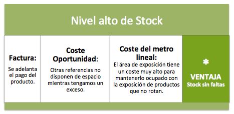 Con todo lo anterior se podría suponer que a menor stock mayor rentabilidad por ventas, sin embargo hay un matiz fundamental, y es que el stock se relaciona con la satisfacción del cliente y la disposición de unidades sin necesidad de realizar un encargo, así pues, debemos procurar que nuestro stock siempre cubra la demanda sin excederse, lo que supone una cifra que oscile entre el 95% y el 97%.