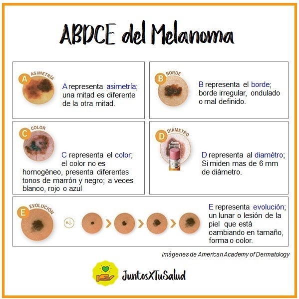 En esta infografía de JuntosXTuSalud, encontrarás con mayor detalle qué aspectos de cada uno de los parámetros a analizar son indican la necesidad de visitar al dermatólogo lo antes posible.