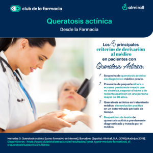 Para ampliar tus conocimientos sobre esta patología te animamos a realizar nuestro módulo formativo sobre queratosis actínica y a descargar las infografías que encontrarás en el apartado Derma de dicha sección. Concretamente, con motivo del Día Europeo de Prevención del Cáncer de Piel 2019 hemos realizado dos nuevas infografías: Queratosis actínica. ¿Dónde aparece? y Queratosis actínica. Desde la farmacia que puedes descargar haciendo click sobre la imagen.