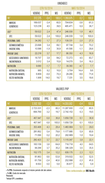 En el análisis pormenorizado de este sector, el área de OTC, ha representado el 36,9 por ciento de las ventas, y dentro de éstas el 18,3 por ciento se refieren a los medicamentos que hacen publicidad al público, el 16,5 a productos de consumo y el 1,9 a productos de consumo. La otra área importante con un 29 por ciento se refiere a los productos de cuidado personal (PEC) y dentro de ellos el 23,4 se refiere a los productos de dermocosmética y el 5,6 a la higiene oral.