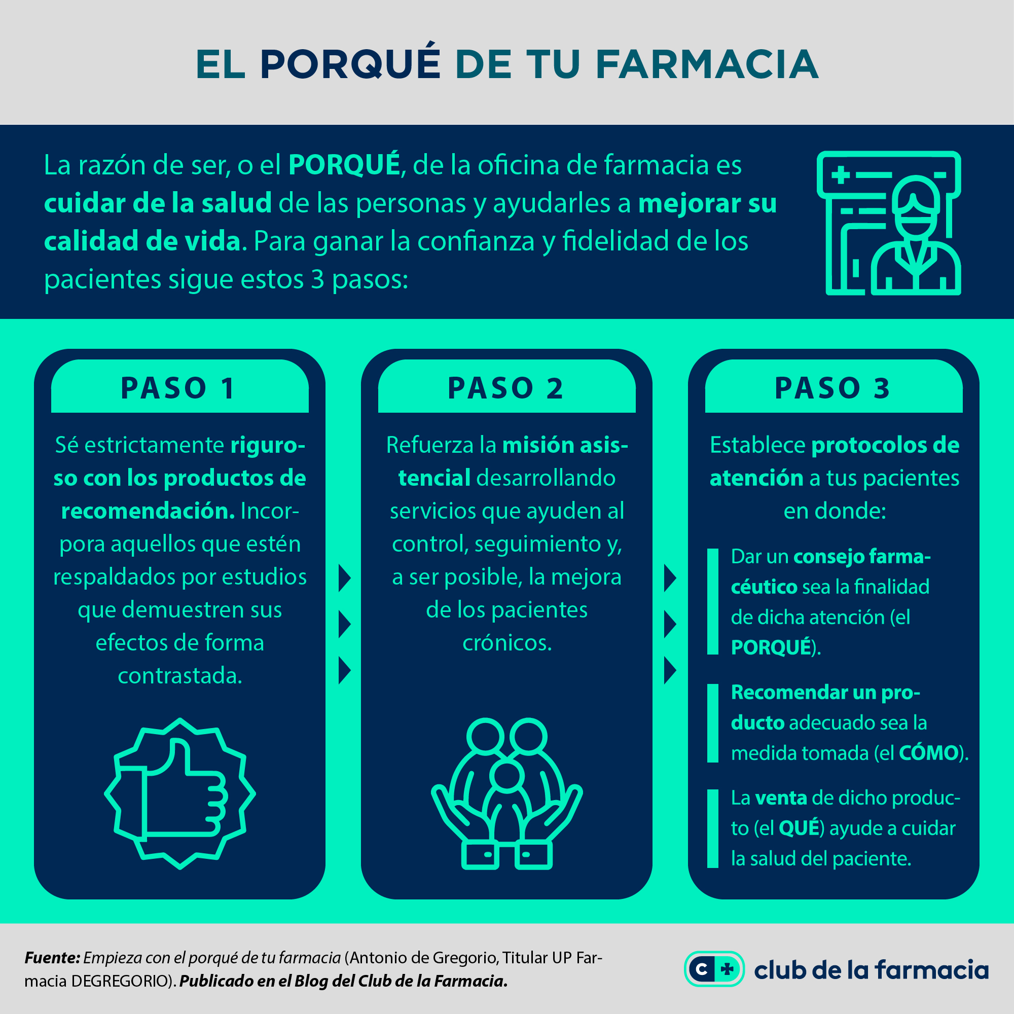 Sea el que fuere, lo que conviene tener claro es que los clientes fieles (que todos queremos) no nos compran lo QUE hacemos sino POR QUÉ lo hacemos, motivados por un sentimiento puramente emocional. Por ello, resulta absolutamente necesario que tanto lo QUE hagamos (por ejemplo, los productos que decidamos ofrecer), como la forma CÓMO lo hagamos (por ejemplo, los protocolos relativos al consejo y recomendación que deben acompañar tanto a la venta como sobre todo a la dispensación) estén en coherencia para poder transmitir con claridad cuál es el sentido y la finalidad que le damos a nuestra Farmacia.