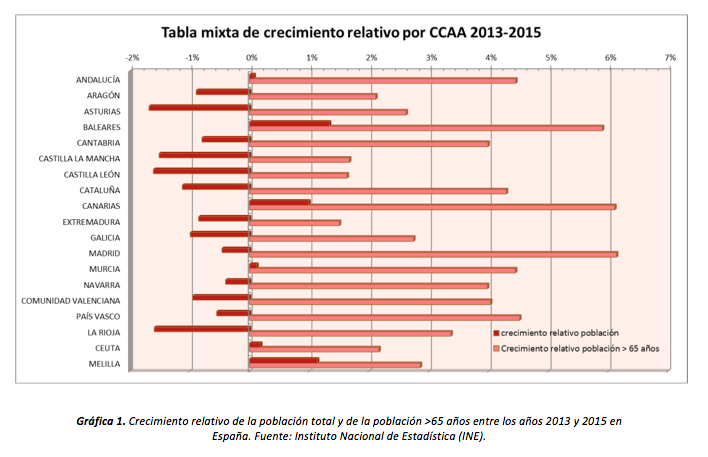 Tal y como observamos en la gráfica anterior, todas las Comunidades Autónomas (CCAA) excepto Baleares, Canarias, Ceuta, Melilla y Murcia presentan algún tipo de decrecimiento de su población total en el año 2015 con respecto al año 2013. Por otro lado, en todo el territorio nacional el crecimiento relativo de la población mayor de 65 años es positivo, siendo Baleares, Canarias y Madrid las tres CCAA que presentan un mayor porcentaje de crecimiento diferencial entre los años 2013 y 2015.