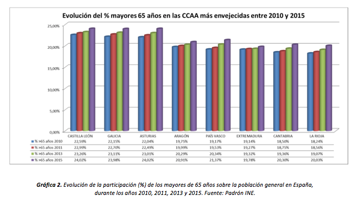 En España, las CCAA más envejecidas son, por este orden, las siguientes: Castilla León, Galicia, Asturias, Aragón, País Vasco, Extremadura, Cantabria y la Rioja. En la Gráfica 2 vemos la evolución (2010-2015) de la participación de los mayores de 65 años sobre la población total. En todos los casos, la tendencia es el incremento de este porcentaje de participación.