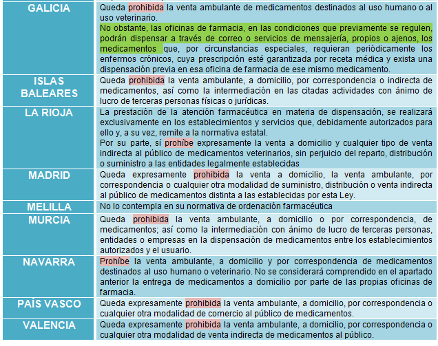 La realidad es que hay algunas Comunidades Autónomas en que se permite la venta a distancia con algunas matizaciones, mientras en el resto, está prohibida. Y, además, la prohibición no alcanza a las empresas de mensajería o aseguradoras que ofrezcan este servicio, por lo que algunos abogados han sembrado dudas sobre la posibilidad de que una farmacia entregue medicamentos a un mensajero con destino al domicilio de un paciente.
