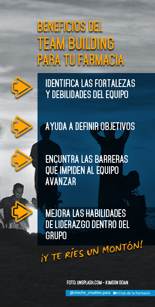 Para que el equipo se coordine, evolucione y tenga éxito debe conocerse y tener experiencias juntos más allá de los ratos que pasan en el trabajo. Y es aquí donde entran en juego lo que se conoce como Team Building, eventos que permiten a los equipos conocerse fuera del ámbito laboral, alejados del contexto (en el caso de nuestro sector) de la bata, el cutter y los probióticos, rompiendo las barreras políticas y personales haciendo que se diviertan. Pueden ser actividades lúdicas normalmente centradas en algún tipo de deporte, aunque también se realizan Jornadas Colectivas, Eventos de Motivación, comidas de empresa o viajes en grupo… Y eso sí, siempre fuera del horario de trabajo y lo más lejos posible de la farmacia.