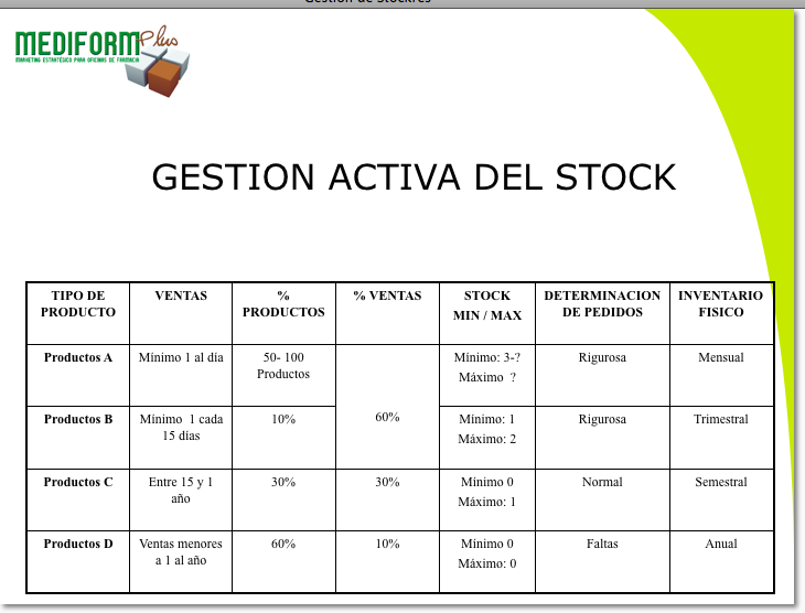 En una Gestión de Stock eficaz está muy relacionada con la capacidad de compra de la farmacia, el vencimiento de la factura del producto comprado, la previsión de la demanda, el tipo de producto comprado y su proveedor y por último, la proporcionalidad entre el precio de coste y el volumen de la compra.