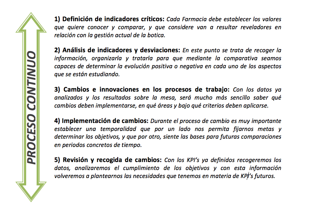 En conclusión, el Farmacéutico titular encuentra en la definición de KPI’s un apoyo para la monitorización del estado de su negocio de manera periódica, el gestor de cada categoría una pauta para determinar nuevas acciones que incentiven las mejoras y el resto del equipo una guía sobre las necesidades para el cumplimiento de objetivos, en definitiva, una forma de analizar la Farmacia desde distintas perspectivas, determinar el grado de éxito de las estrategias actuales y mejorar la capacidad para la toma de decisiones futuras.