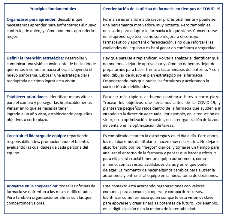 Cambios horarios, reorganización de tareas y establecimiento de nuevas prioridades son algunas de las fases por las que ya han pasado estos meses las oficinas de farmacia. Pero repasemos algunos de los principios fundamentales que ayudan a liderar hacia transiciones efectivas en momentos de cambio:[1]