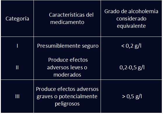 Tabla de clasificación por categorías de medicamentos según su capacidad para alterar la conducción de vehículos y un grado alcoholemia considerado equivalente elaborada en 1992.