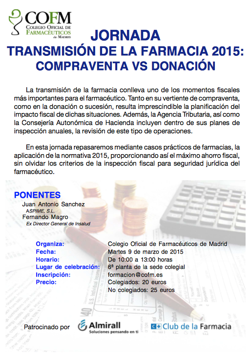 Empezamos el mes con la charla patrocinada por El Club de la Farmacia en Madrid, de la mano de D. Juan Antonio Sánchez, socio y corrdinador general de Aspime SL y D. Fernando Magro, Ex Director general de Insalud, con el título de: «TRANSMISION DE LA FARMACIA 2015:COMPRAVENTA VS DONACION». Será el 9/3/15 de 10 a 13h en el COFMadrid de 10 a 13h y los interesados deben apuntarse a través del correo: formacion@cofm.es