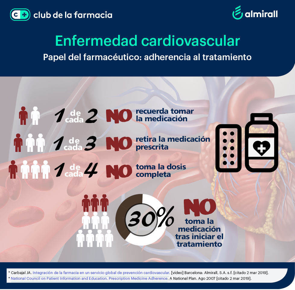 La toma correcta de la medicación pautada por el médico juega un papel muy importante en la prevención del riesgo cardiovascular. No obstante, los datos nos indican que esta correcta adherencia al tratamiento no está siendo llevada a cabo por un importante número de pacientes: