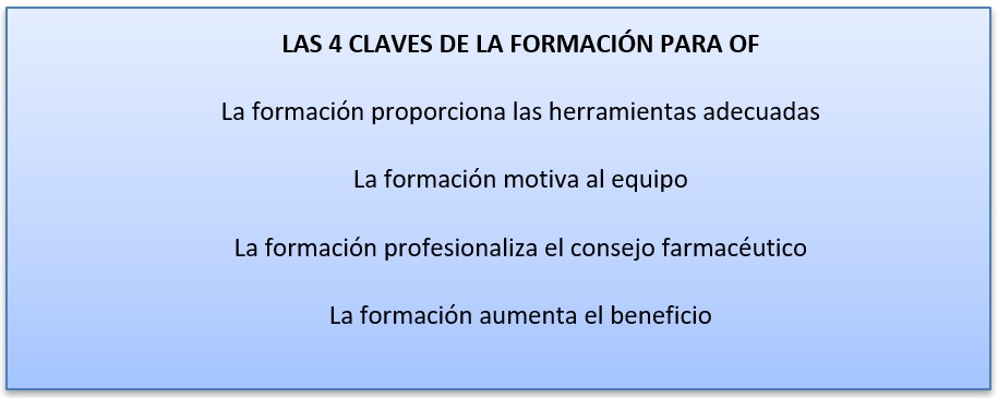 Debemos pensar en las formaciones como una estrategia dirigida tanto a aumentar la eficacia de los equipos como a potenciar la capacitación de los titulares y gerentes. Además, debe enfocarse siempre como una herramienta que favorezca así la motivación del equipo para ofrecer un mejor consejo, aumentar la venta complementaria, fidelizar a nuestros pacientes y optimizar la gestión de la farmacia para competir con el mercado actual.