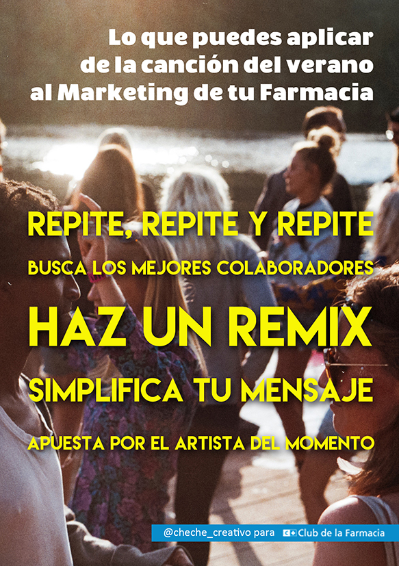 - Repetir, repetir y repetir. En la radio, en el supermercado, en la televisión… las canciones del verano se repiten sin parar durante los meses estivales en todas las plataformas posibles. ¿Cómo se traduce esto al Marketing de tu Farmacia?. Repite tu mensaje cada vez que sea necesario y en todos los soportes disponibles: escaparate, redes sociales, email… de esta forma llegarás a todos tus clientes. Eso sí, no te pases. Estudia bien el impacto que tiene cada una de las herramientas de comunicación que utilizas, como debes adaptar el mensaje y qué dosis tienes que preparar. Recuerda que lo mucho cansa…