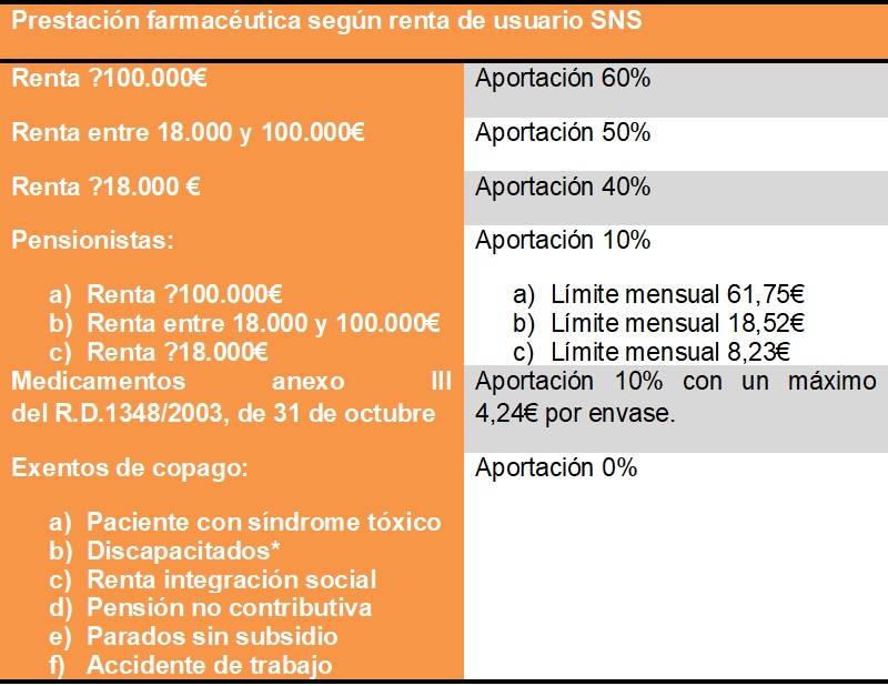 El contenido de la cartera común de servicios del Sistema Nacional de Salud (SNS) que está regulado en la Ley 16/2003, de 28 de mayo, y en el art. 2 del RD 1030/2006 de 15 de septiembre establece un copago por el que: