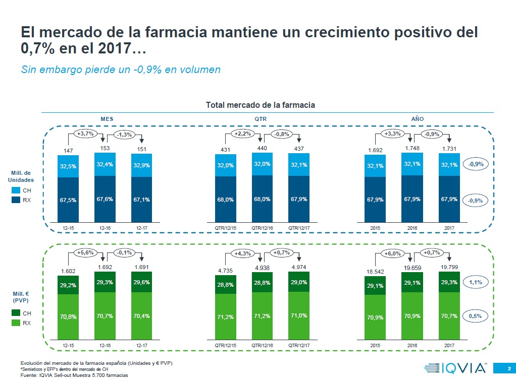 Después de varios años de crecimientos a buen ritmo, en 2017 el mercado farmacéutico ha moderado sus crecimientos. De hecho en valores (€) el mercado ha crecido únicamente un 0,7% y en volumen (unidades) ha decrecido un -0,9%. Prácticamente se mantiene plano con respecto a 2016 y desde IQVIA se ha intentado buscar una explicación de las razones que han llevado a esta situación.
