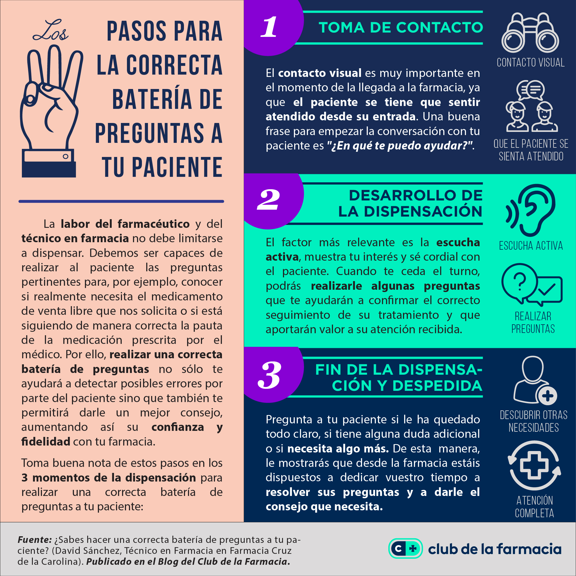 Para realizar una correcta batería de preguntas a tus pacientes te aconsejo seguir estas pautas clasificadas en los tres momentos de la dispensación: la toma de contacto con el paciente, el propio desarrollo de la dispensación y el fin de la dispensación y despedida.