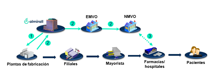 - Notificamos los números de serie a la Organización Europea de Verificación de Medicamentos (EMVO), que se pone en contacto con la Organización Nacional de Verificación de Medicamentos (NMVO) del país correspondiente.